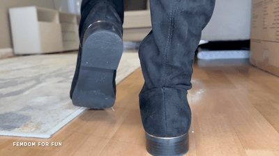 Damit die Herrin ihre Stiefel ablegen kann, benutzt sie ihren Sklaven als menschlichen Fußhocker. Bei dieser Gelegenheit kann er auch gleich ihre wundervollen Stiefel sauber lecken. Der Loser ist nicht mehr als nur ein menschlicher Fußabtreter für seine strenge Stiefelherrin. Sie liebt es, den Loser bei der Stiefeldomination leiden zu lassen. Mit den Sohlen der Overknees fährt die sadistische Herrin über das Gesicht des Sklaven und ignoriert sein Gejammer. Zwischendurch gibt es ein paar Tritte in das hässliche Gesicht des Losers.